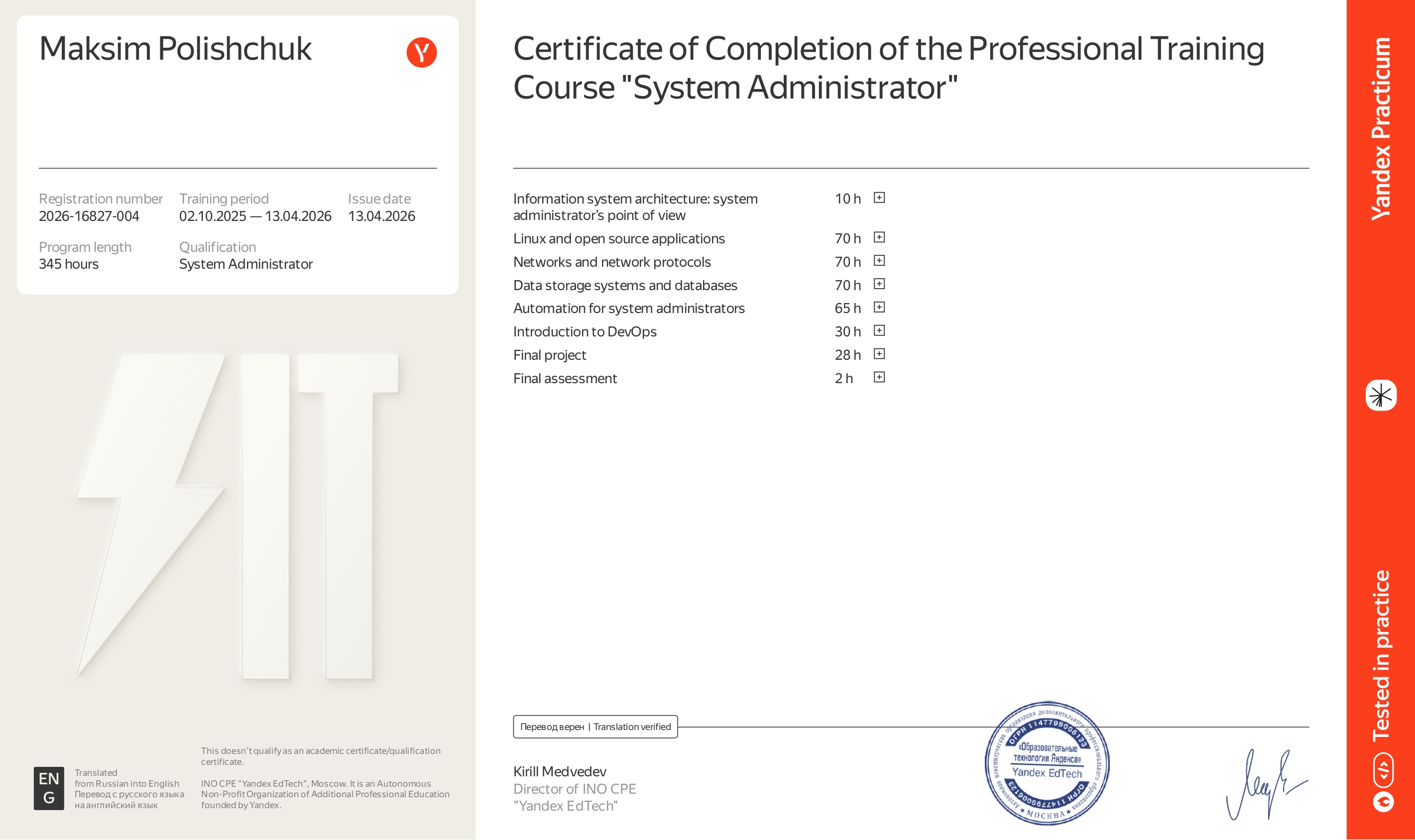 13.04.2026 - Certificate of Completion ofthe Professional Training Course "System Administrator"