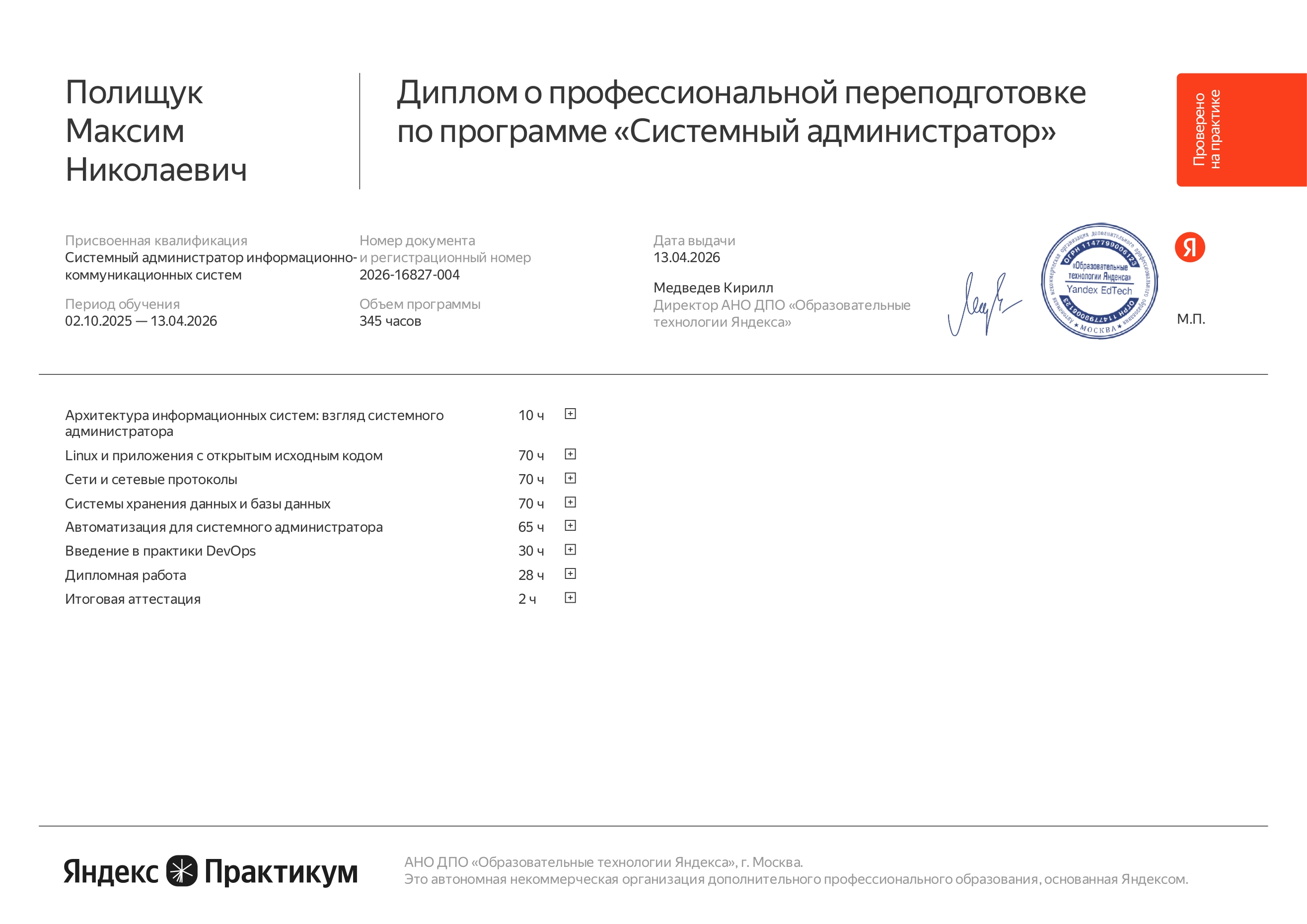 13.04.2026 - Диплом о профессиональной переподготовке по программе «Системный администратор»
